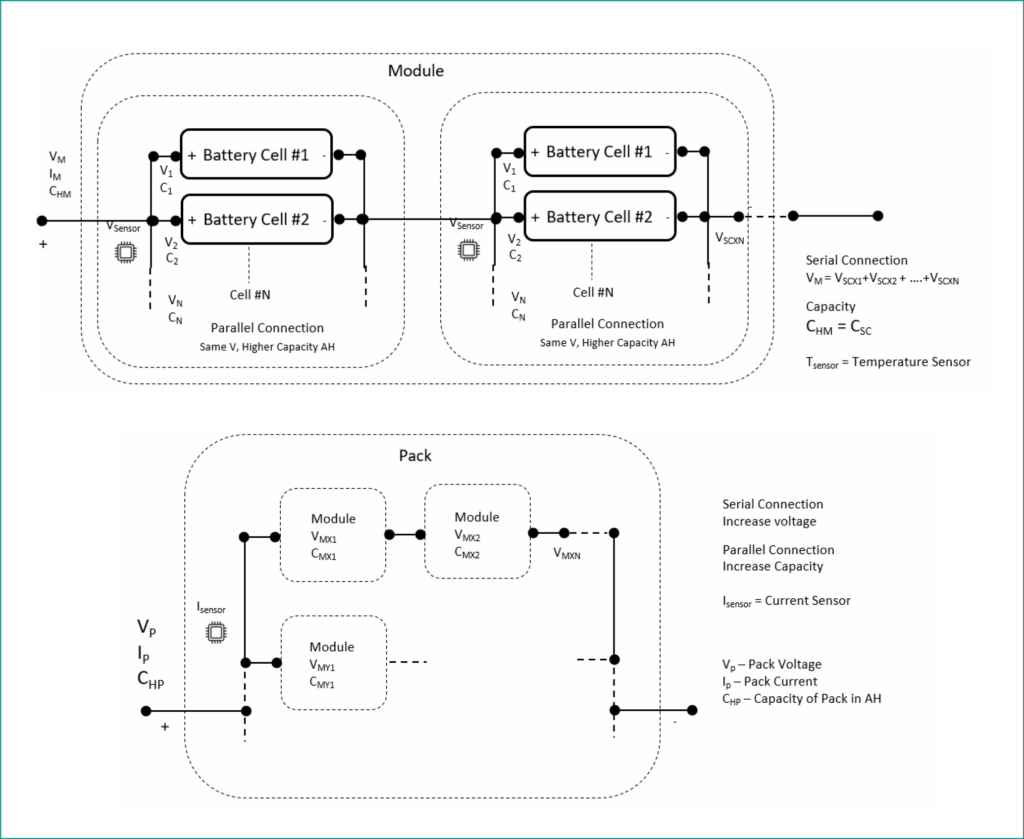 At the most fundamental level, deconstructing the battery pack to its battery cells shows how these basic electrochemical units store and release electrical energy. Multiple serially connected battery cells assembled into a single unit form a module which serves as intermediate level of energy storage. Finally, multiple modules connected, typically in series, form a complete battery pack. The chosen configuration of the pack matches the specific energy (kWh) and power (kW) requirements of the EV. While the overall capacity of the pack (in ampere-hours, Ah) is a function of the number of cells connected in parallel, the total voltage of the pack is determined by the modules connected in series. Figure 1 visually demonstrates this concept.
