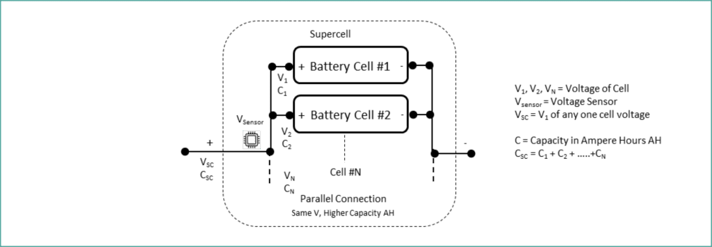 Individual cells can vary in chemistry, capacity, and voltage. By connecting these cells in parallel, as illustrated in the Figure 1, the combined capacity (Ah) increases, providing a higher energy reserve while maintaining the same voltage level. This configuration is beneficial for extending the operational range of the EV by increasing the total available ampere-hours.