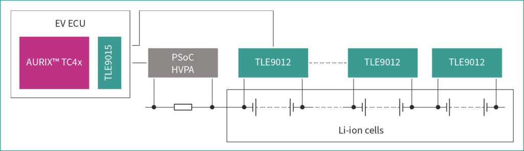The PSoC™ 4 High Voltage (HV) Precision Analog (PA) device with high-precision sigma delta ADCs (16-20 bits) provides precise and accurate battery monitoring (e.g., current sensing via shunt) for advanced applications like AIbased BMS solutions. The programmable system on chip (PSoC™) MCU supports synchronization with other BMS devices by communicating in the same daisy chain as the TLE9012DQU battery monitoring and cell balancing ICs. Also, the programmability of the PSoC™ 4 HV PA enables additional functionality to be integrated into a single IC, including pack-monitoring, contact-monitoring, isolation resistance, and pyro-fuse driving.
